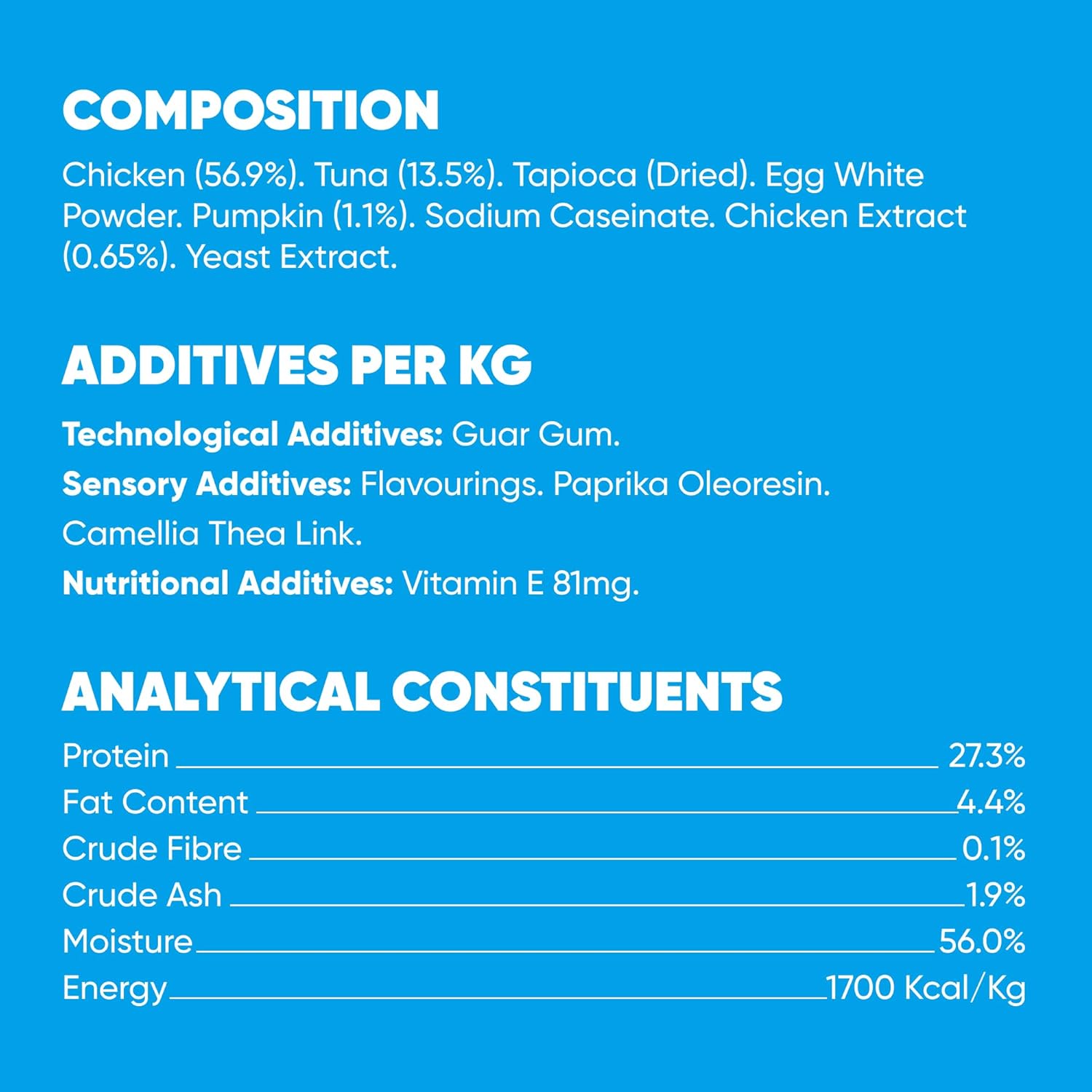 Composition: Chicken (35.5%), Tuna (34.8%), Tapioca (Dried), Egg White Powder, Cheese (1.1%), Sodium Caseinate, Chicken Extract (0.4%), Tuna Extract (0.3%), Yeast Extract.