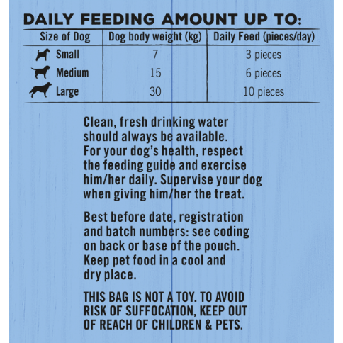 Clean, fresh drinking water should always be available. For your dog's health, respect the feeding guide and exercise him/her daily. Supervise your dog when giving him/her the treat.