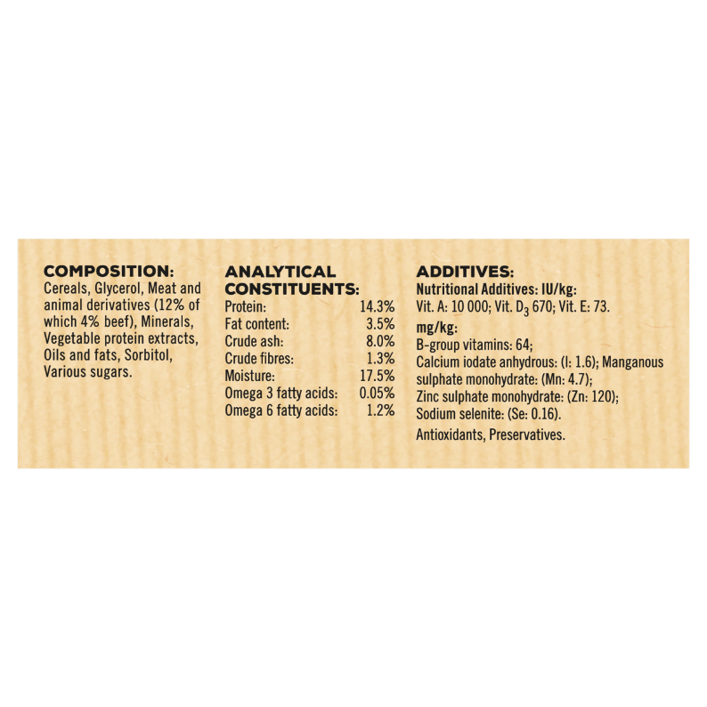 Composition: Cereals, Glycerol, Meat and animal derivatives (12% of which 4% beef), Minerals, Vegetable protein extracts, Oils and fats, Sorbitol, Various sugars.