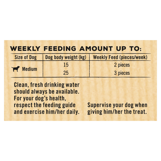 Clean, fresh drinking water should always be available. For your dog's health, respect the feeding guide and exercise him/her daily. Supervise your dog when giving him/her the treat.