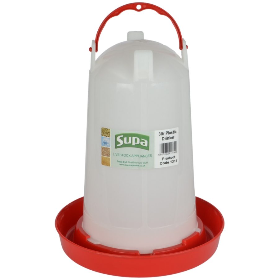 Supa Red and; White Drinker 3 Litre is a robust gravity fed drinker. The drinker can be ground based or hanging and is suitable for poultry and; game birds. Also suitable for cage and; aviary birds. The handle is ergonomically designed so make sure when carrying the drinker, you can do it with ease. Reduces the chance of the water becoming contaminated. Has a dosage scale so that medication can be added to the water accurately. The drinker has a dome shaped top to deter the birds standing on the top and contaminating the water. Easy to fill and easy to clean. Made in the UK. To Fill: Turn the drinker upside down, remove the base by twisting anti-clockwise and lifting the base off. Fill the drinker with water and lock the base into place by twisting clockwise ensuring the base and the body lock together. Turn back over and the drinker is ready for use. Dimensions of 3 litre drinker with handle in the down position: 21cm (W) x 21.0cm (D) x 26.5cm (H) Dimensions of 3 litre drinker with handle in the up position: 21cm (W) x 21.0cm (D) x 30.5cm (H)