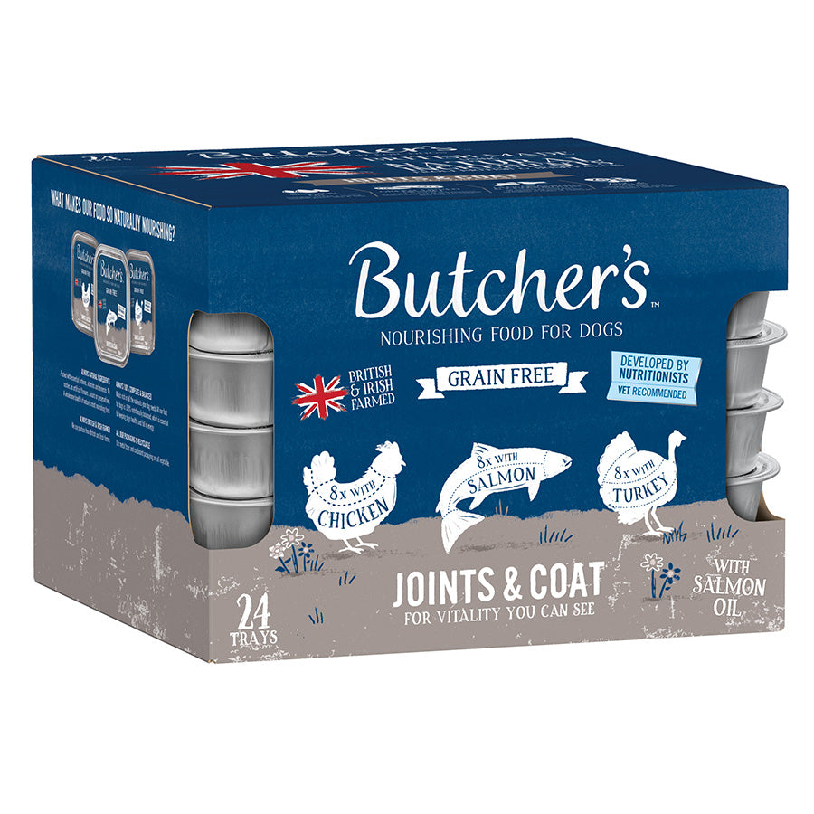 Butcher's Joints and Coat recipes are Vet Recommended and carefully created by a Nutritionist with exactly the right amount of naturally active ingredients to support Healthy Joints, Skin and Coat. These 100% complete and balanced, grain free recipes contain a combination of the ingredients which are all necessary to help support and maintain healthy joints, skin and coat for your dog.