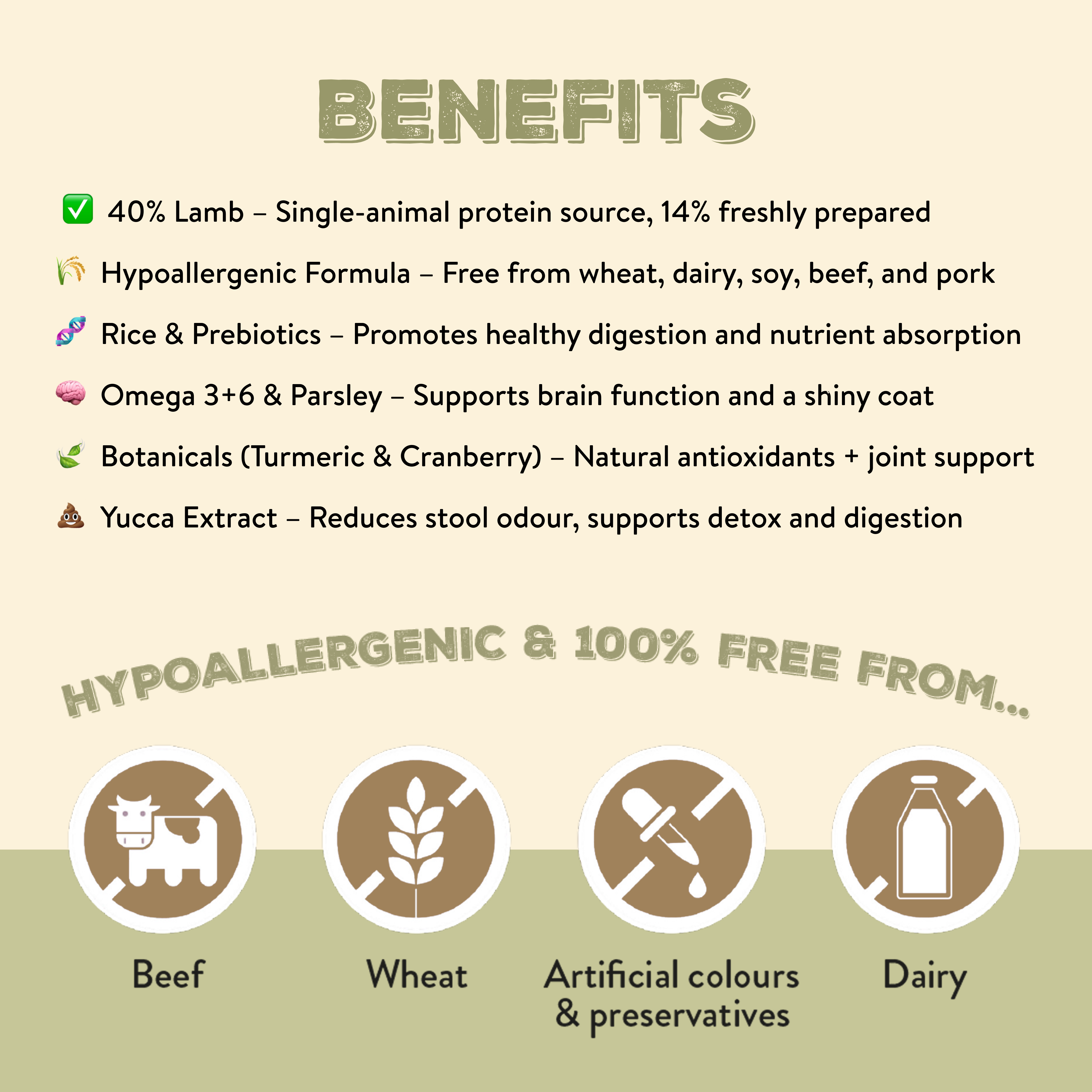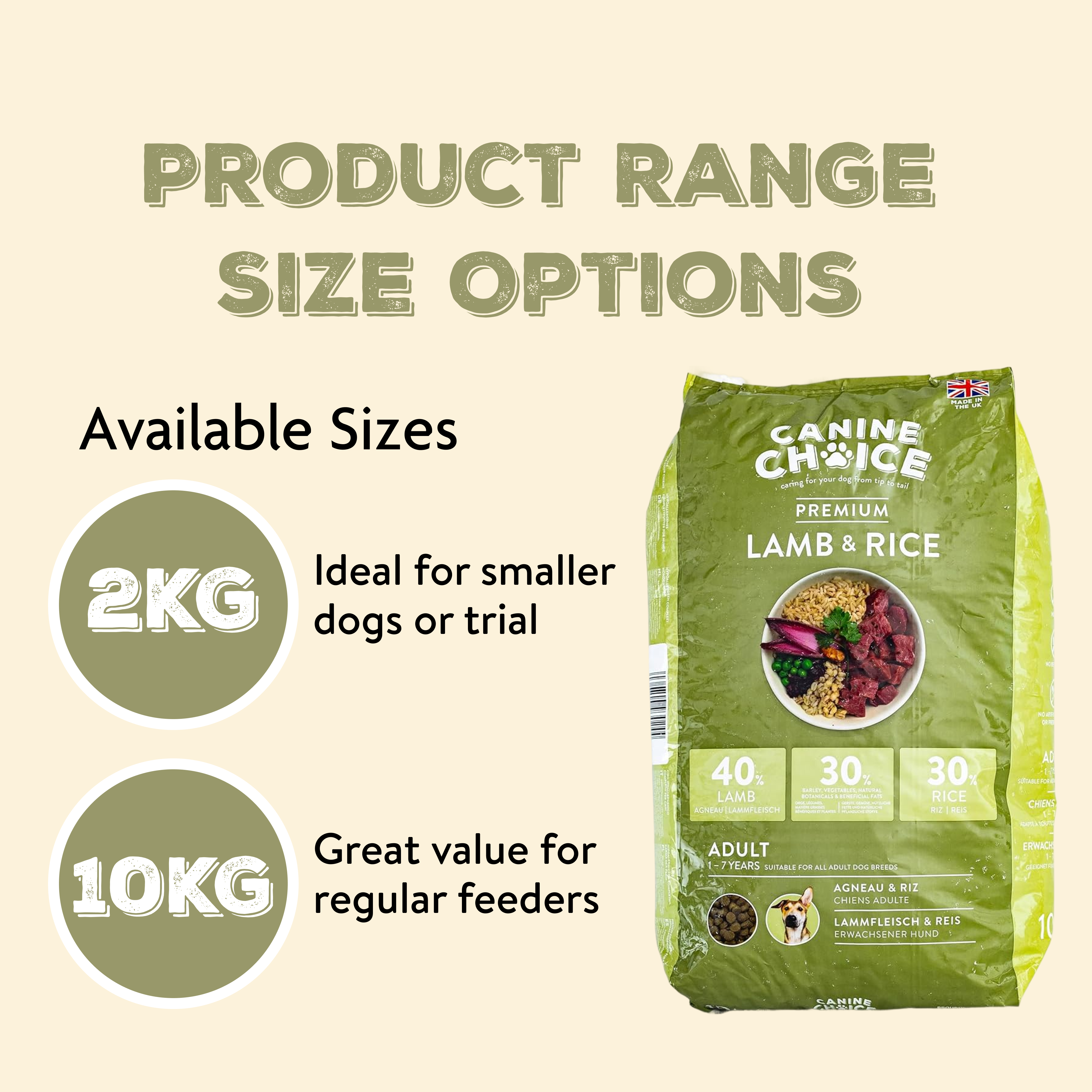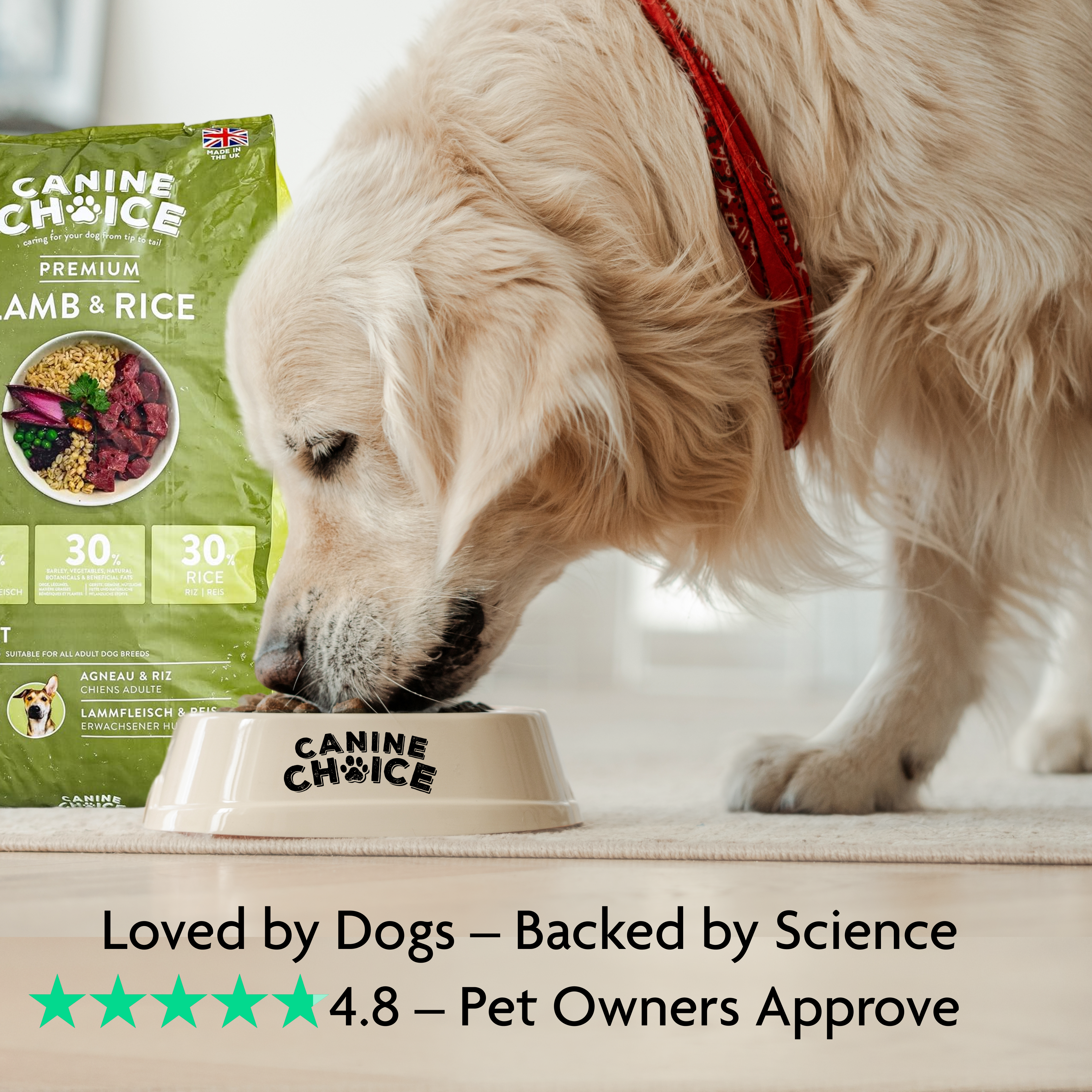 Canine Choice Premium Hypoallergenic Adult Dry Dog Food – Lamb & Rice is designed with your dog’s happiness and health in mind! Packed with 40% lamb (including 14% freshly prepared), this nutritious recipe provides essential protein to support muscle maintenance and overall health in your canine companion.