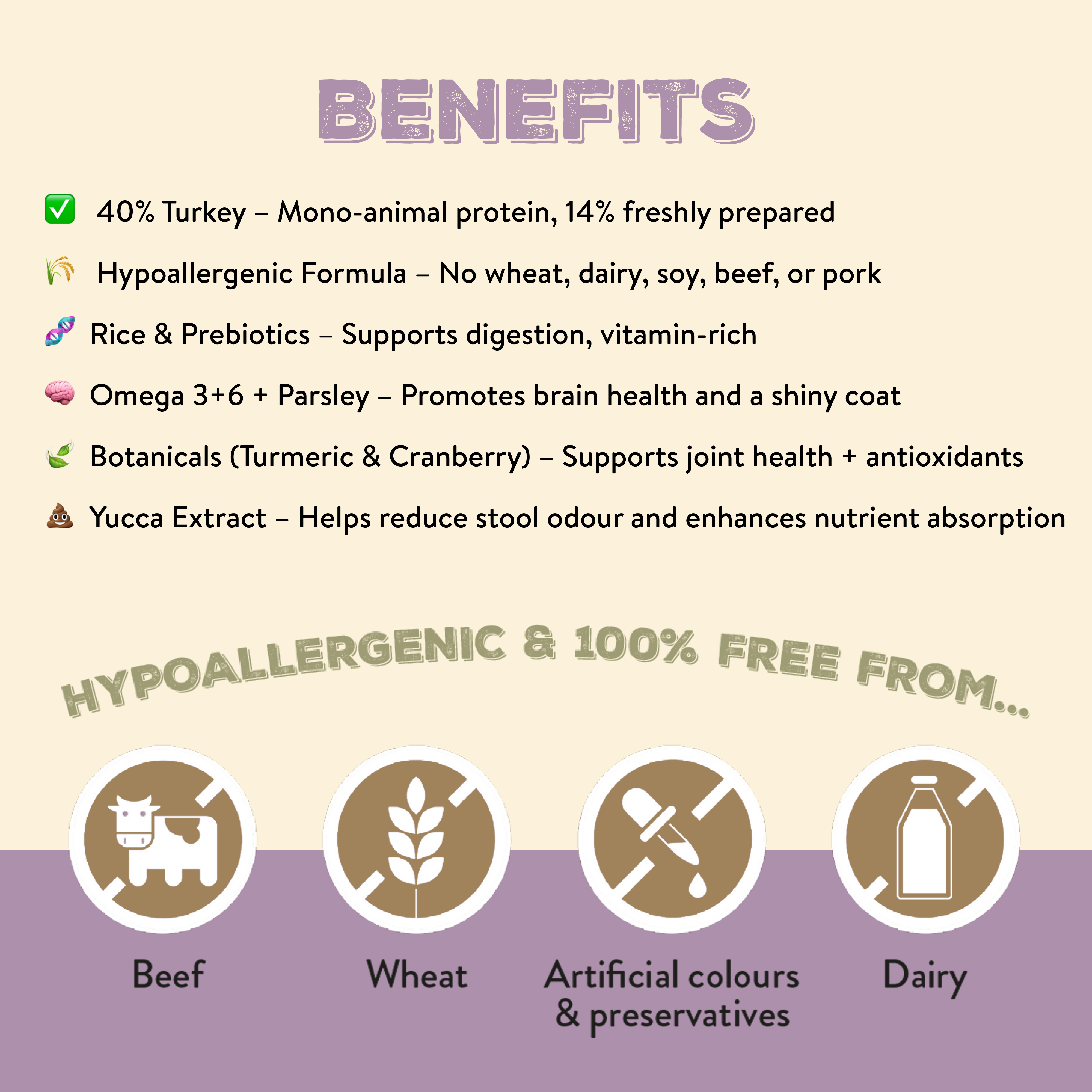 Canine Choice Premium Hypoallergenic Adult Dry Dog Food – Turkey & Rice is designed with your dog’s happiness and health in mind! Packed with 40% turkey (including 14% freshly prepared), this nutritious recipe provides essential protein to support muscle maintenance and overall health in your canine companion.
