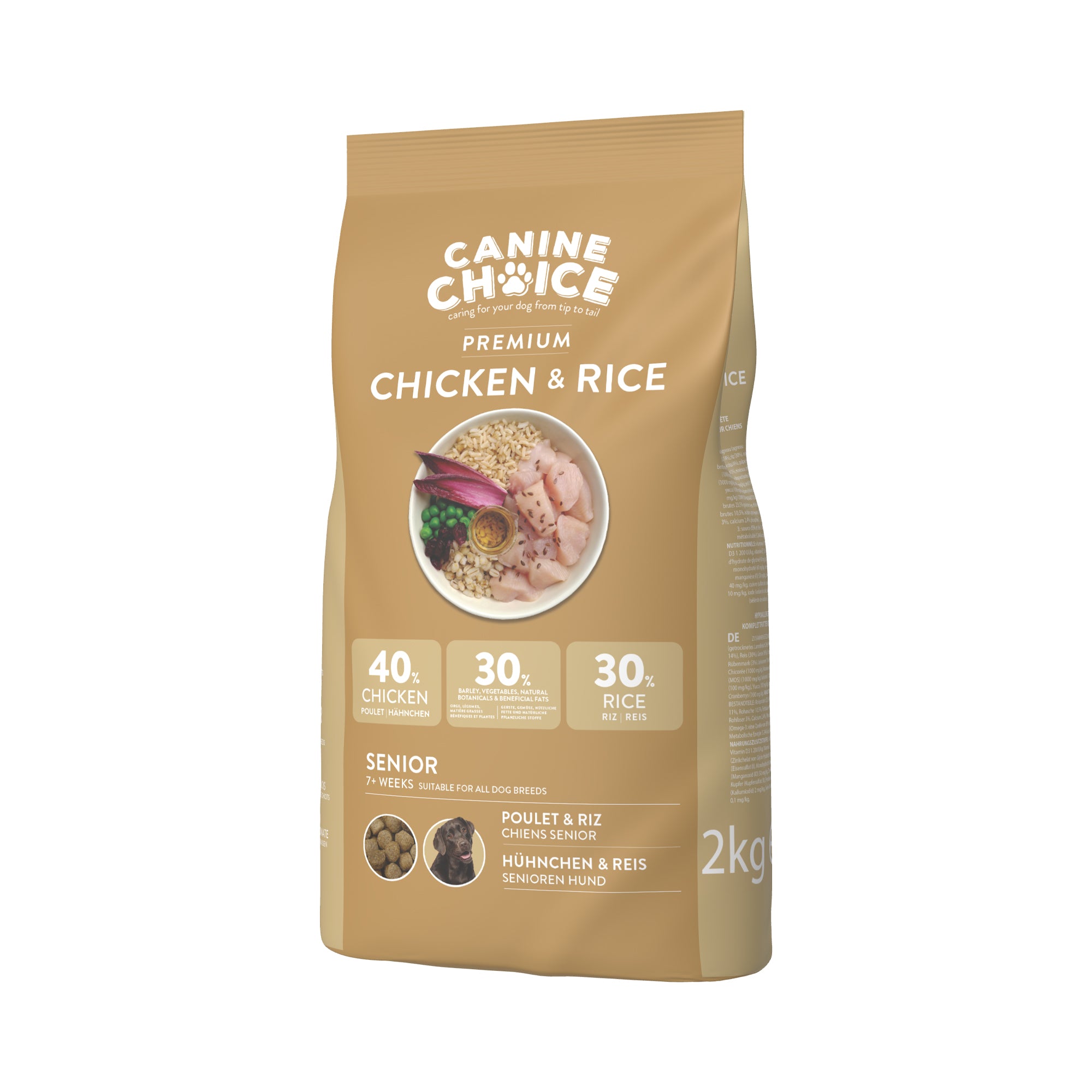 Canine Choice Premium Hypoallergenic Senior Dry Dog Food – Chicken & Rice is designed with your senior dog’s health and well-being in mind! Packed with 40% chicken (including 14% freshly prepared), this nutritious recipe provides essential protein to maintain muscle mass and support overall health as your dog ages.