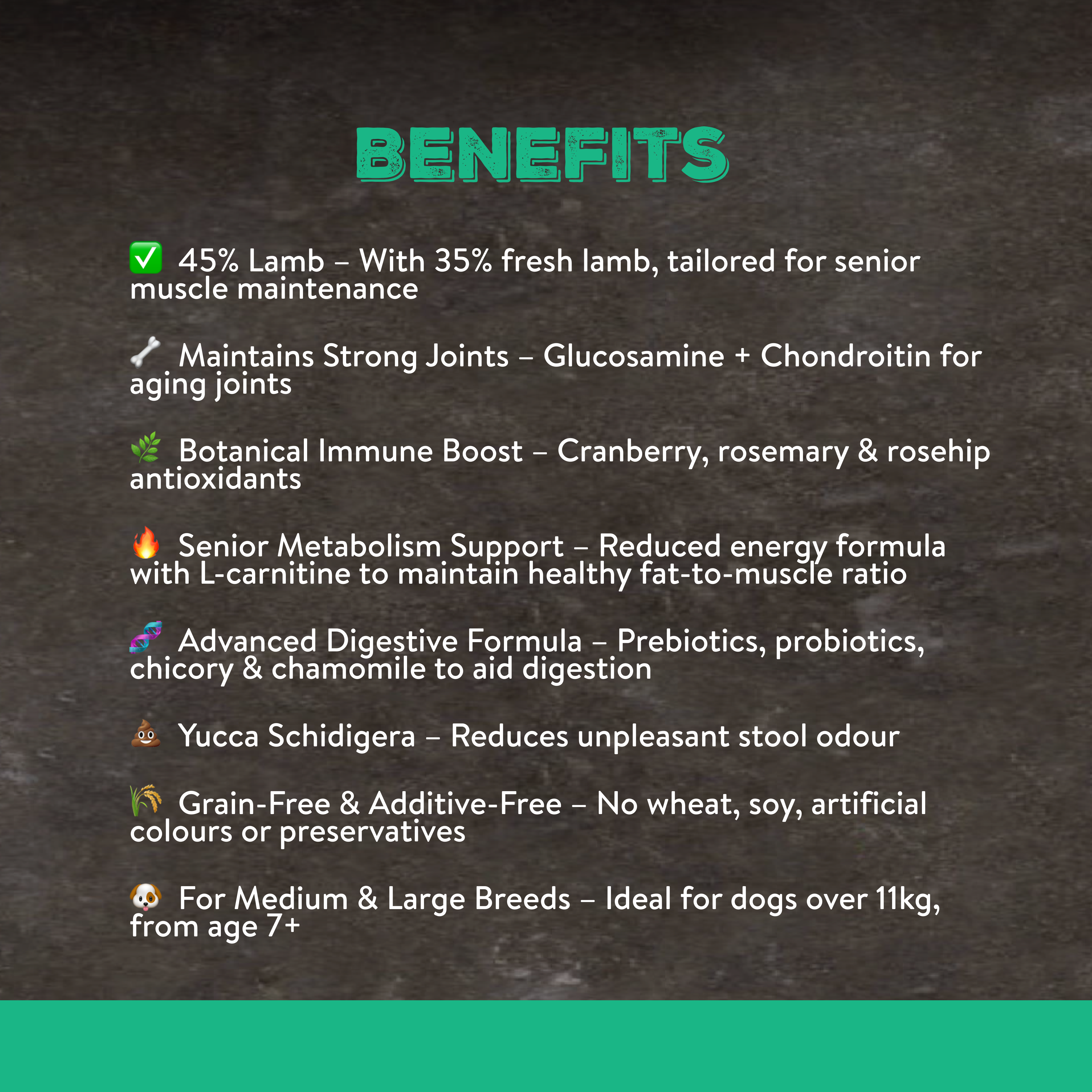 This great-quality food also supports joint health, with glucosamine and chondroitin helping to maintain mobility and flexibility. Omega 3 & 6 fatty acids and essential minerals promote a healthy, shiny coat and nourished skin, while yucca schidigera helps reduce stool odour for a fresher home environment. The immune-boosting blend of cranberries, rosemary, and rosehip provides antioxidant support to keep your senior dog feeling their best.