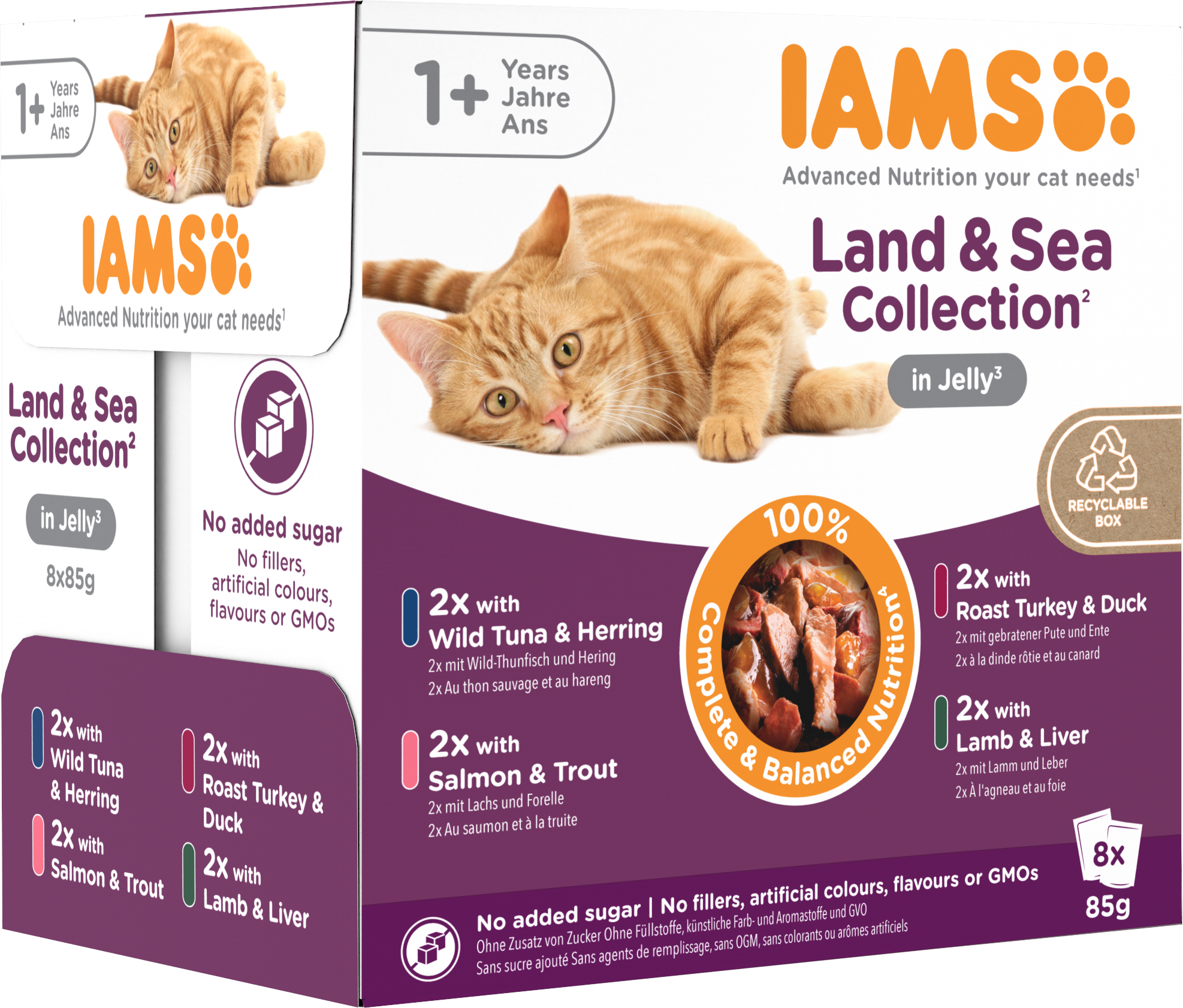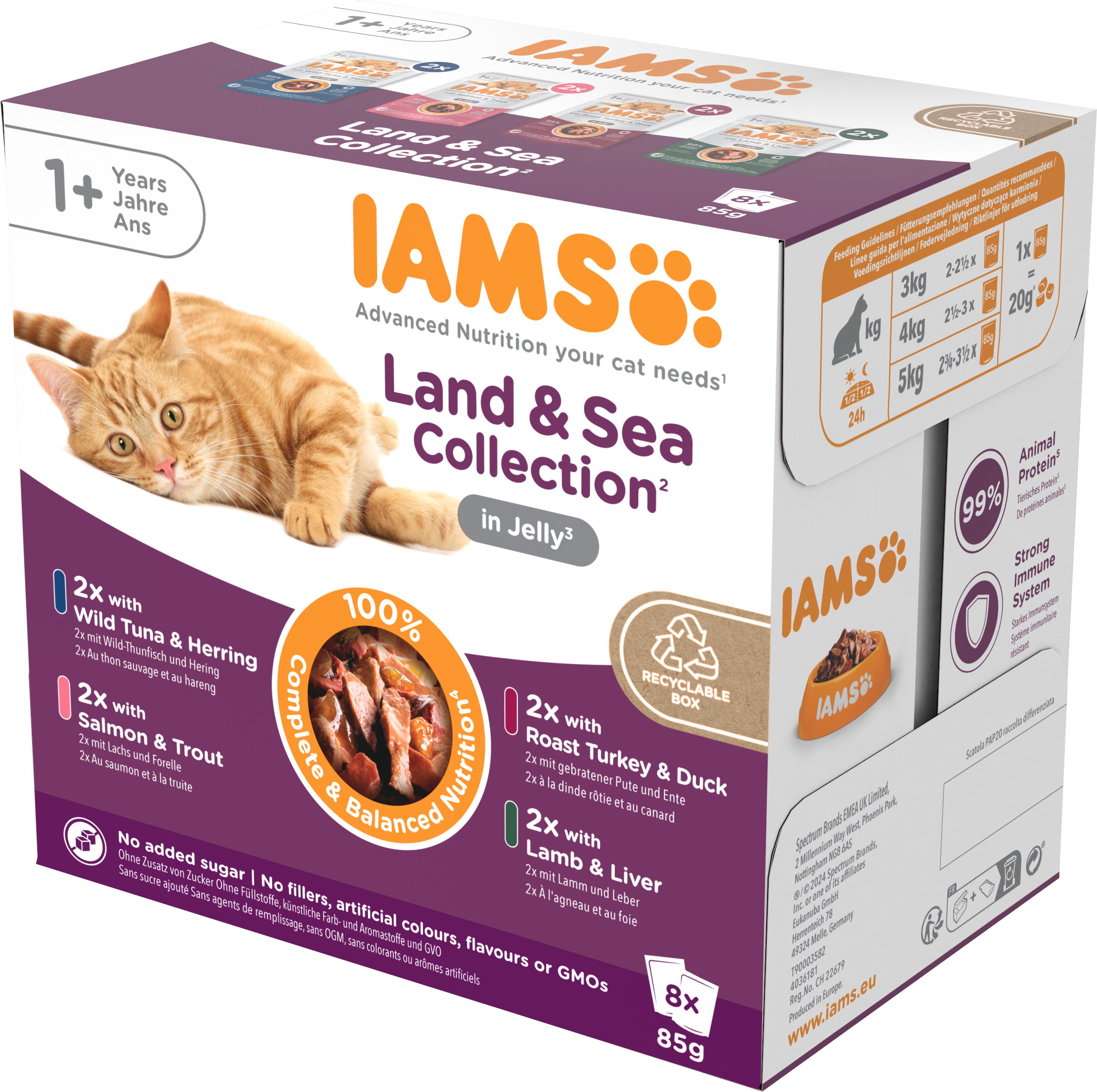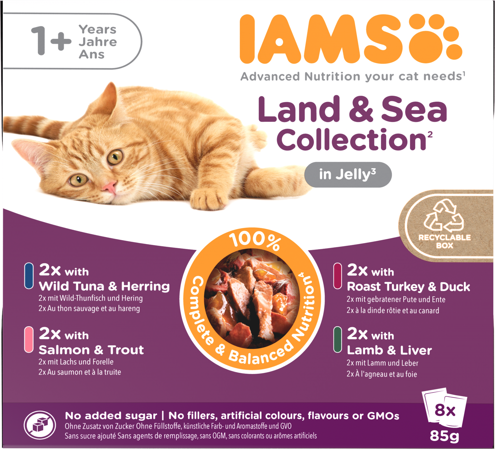 IAMS Advanced Nutrition Meat and Fish Variety Mix in Jelly is a 100% complete and balanced wet cat food, suitable for cats aged 1+ years. IAMS Meat and Fish Variety Mix contains four tasty flavours that your cat will love; Wild Tuna and Herring, Salmon and Trout, Roast Turkey and Duck, and Lamb and Liver. Our advanced nutrition recipes are adapted to support your cat's health, providing all the nutrients your cat needs. IAMS adult cat food meat and fish variety mix contains 99% animal protein, out of total protein, to provide the foundation of their natural diet and the antioxidant vitamin E to support a strong immune system. IAMS wet cat food recipes contain no added sugar - for a high-quality, balanced wet food aligned to your cat's natural diet.