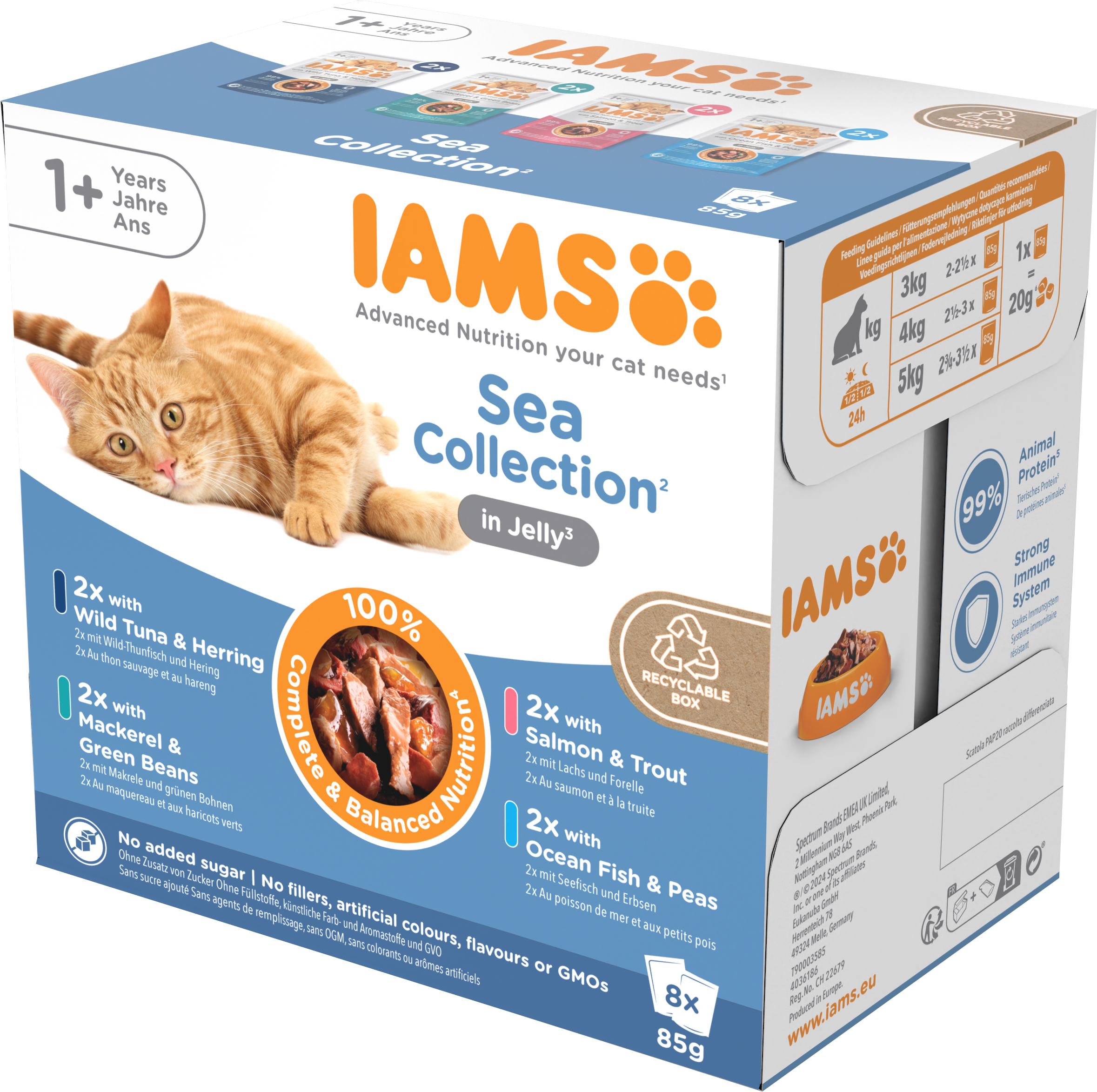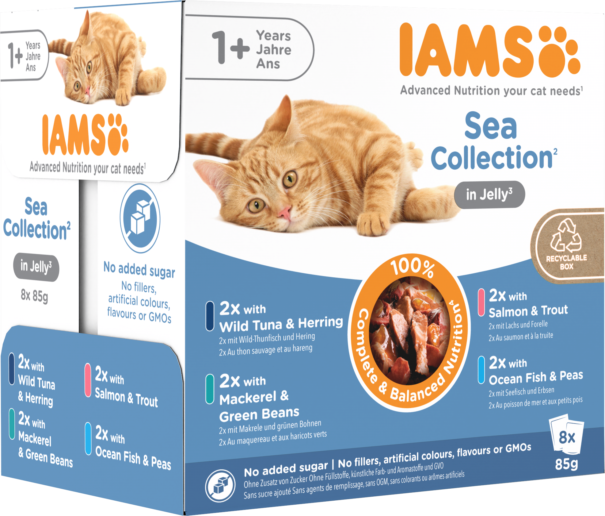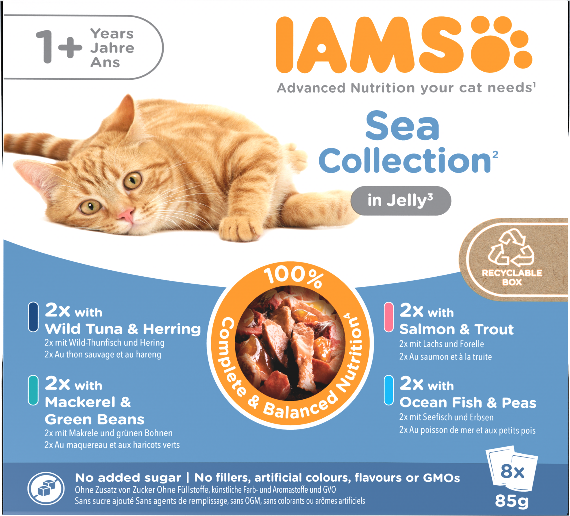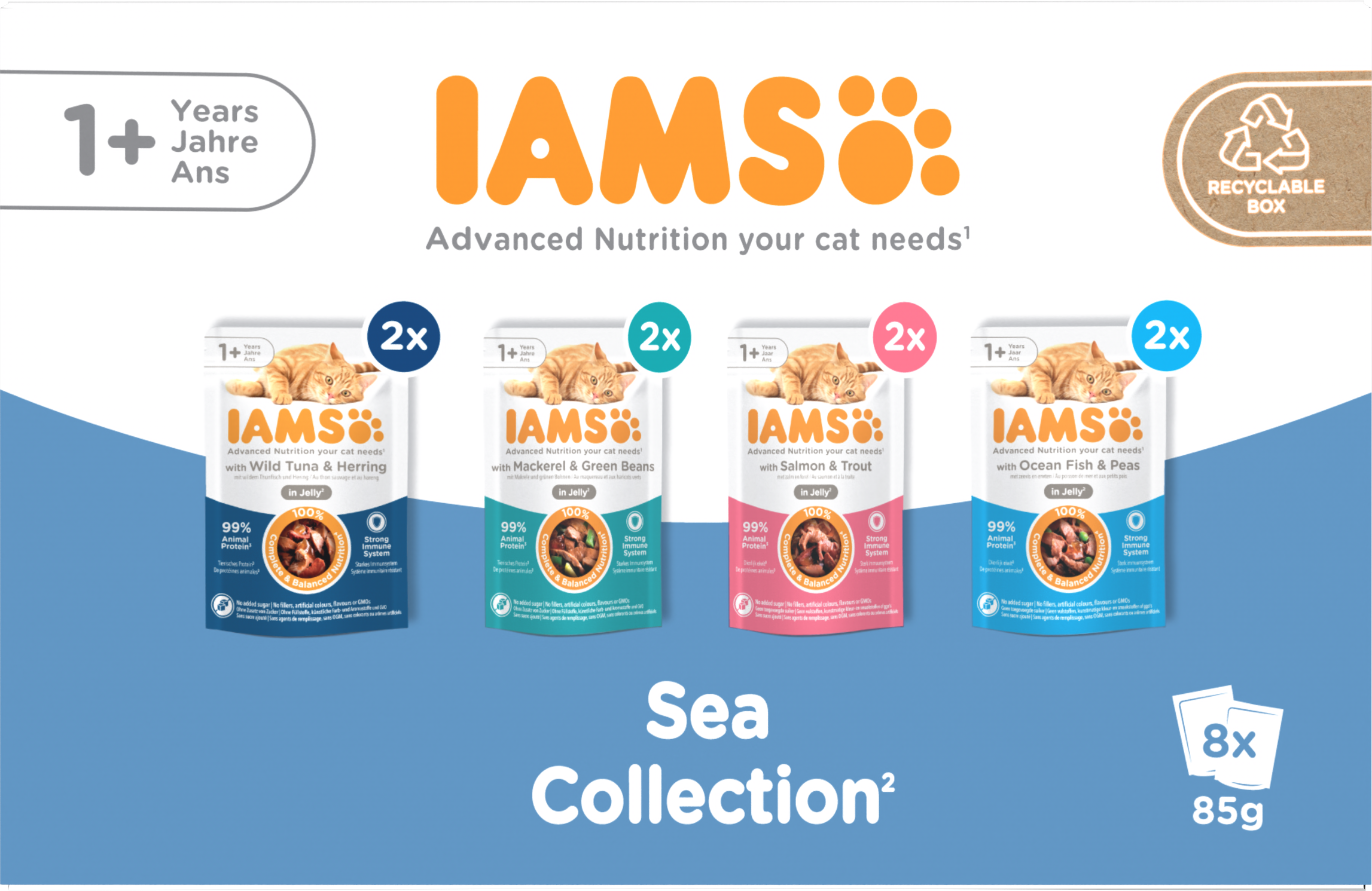 IAMS Advanced Nutrition Fish Variety Mix in Jelly is a 100% complete and balanced wet cat food, suitable for cats aged 1+ years. IAMS Fish Variety Mix contains four tasty flavours that your cat will love; Wild Tuna and Herring, Mackerel and Green Beans, Salmon and Trout, and Ocean Fish and Peas. Our advanced nutrition recipes are adapted to support your cat's health, providing all the nutrients your cat needs. IAMS adult cat food fish variety mix contains 99% animal protein, out of total protein, to provide the foundation of their natural diet and the antioxidant vitamin E to support a strong immune system. IAMS wet cat food recipes contain no added sugar - for a high-quality, balanced wet food aligned to your cat's natural diet.