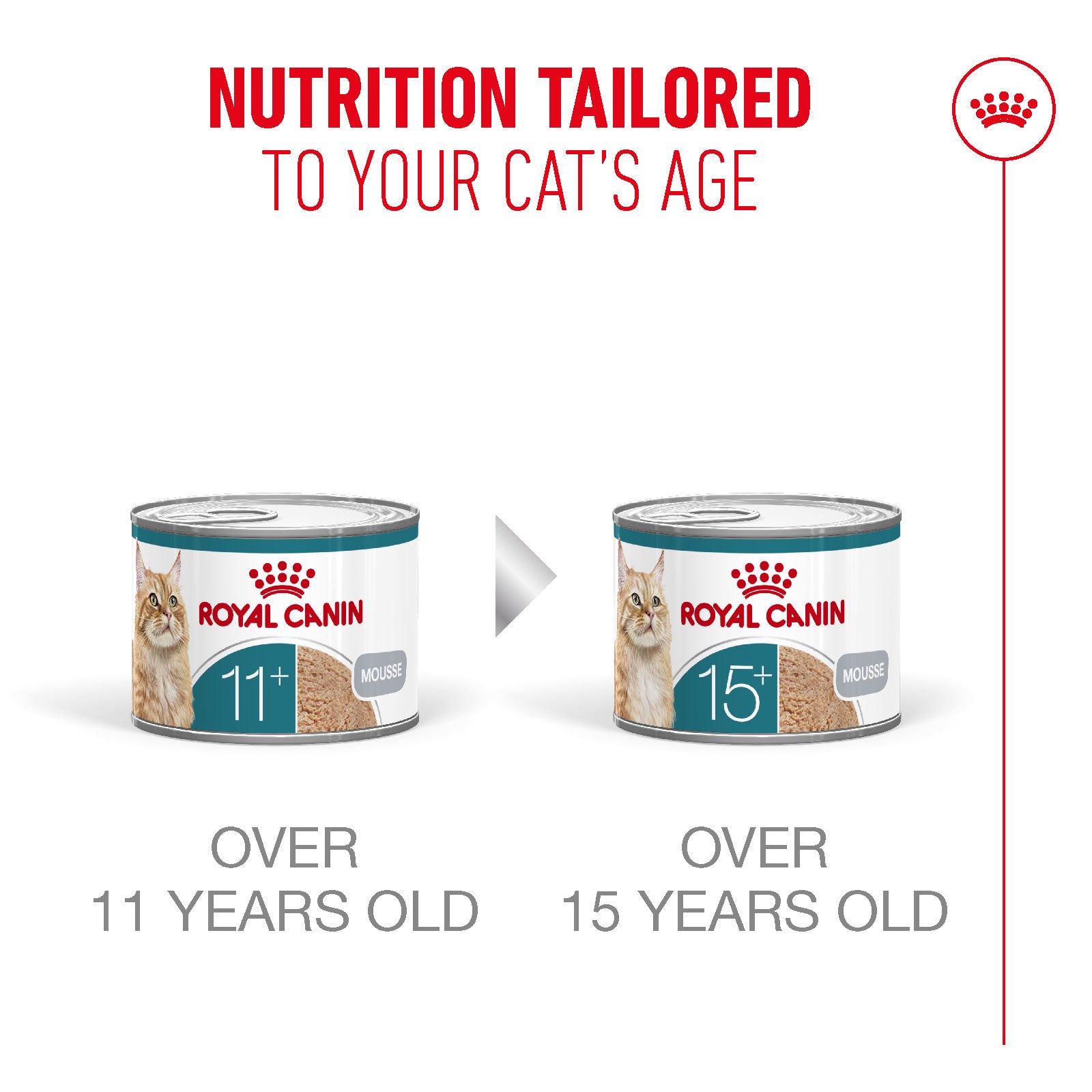 When cats enter their senior years at around 10+ years old, their lifestyle and health needs begin to change. Recognising these changes early can help to maintain their well-being and quality of life as they age. ROYAL CANIN Ageing 11+ Mousse is a wet food diet suitable for cats aged 11 and above. This formula offers a precisely balanced blend of nutrients to help maintain their health and vitality as they enter their senior years. Easy-to-eat texture Designed for—and tested with—senior cats, ROYAL CANIN Ageing 11+ Mousse features an easy-to-eat texture to give your cat an enjoyable mealtime experience. HealthyAge7 Complex This formula, featuring our HealthyAge7 Complex, provides a precise nutritional blend designed to help maintain seven key dimensions of health and vitality in cats over the age of 11. Appetite and weight: Highly palatable and energy-rich to support a healthy appetite and help maintain an ideal weight. Digestion: Contains prebiotic fibres and highly digestible proteins to support healthy digestion. Mobility: Features EPA & DHA and chondroitin to support joint health and mobility. Skin and coat: The inclusion of linoleic acid and zinc helps maintain skin and coat health. Kidneys: Contains high-quality protein and adapted phosphorus levels to support kidney health. Brain and vision: Includes tryptophan, EPA & DHA, taurine, and vitamin A to support cognitive function and vision. Immunity: Contains vitamins C & E, lutein, taurine, beta-carotene, and lycopene to help support the immune system. Mix-feeding your senior cat ROYAL CANIN Ageing 11+ is available in a variety of textures, including chunks in jelly, chunks in gravy, and as a dry kibble diet. These options can enhance mealtime enjoyment and bring added variety to your cat's diet, making them ideal for a balanced mixed feeding approach.