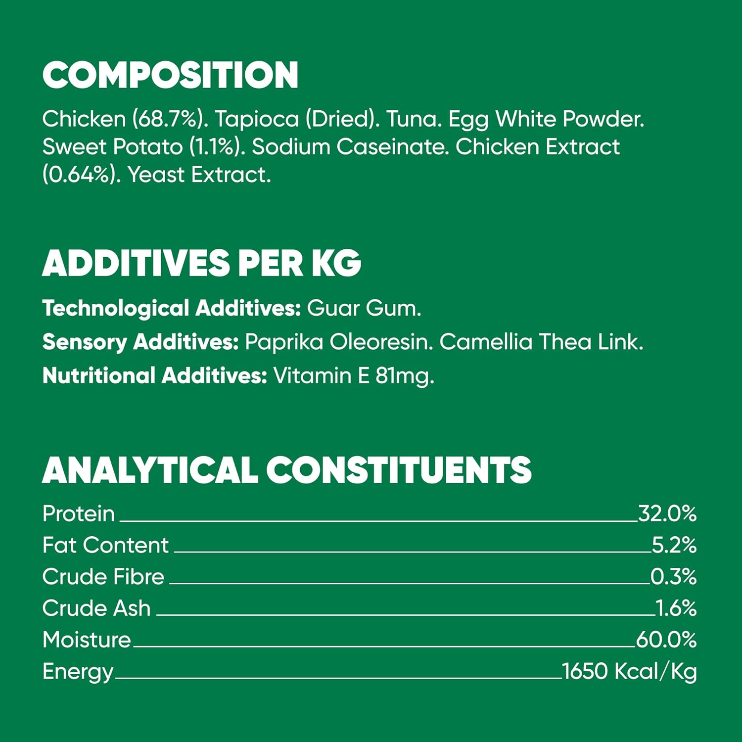 Composition: Chicken(68.7%), Tapioca (Dried), Tuna, Egg White Powder, Pumpkin(1.1%), Sodium Caseinate, Chicken Extract(0.64%), Yeast Extract.