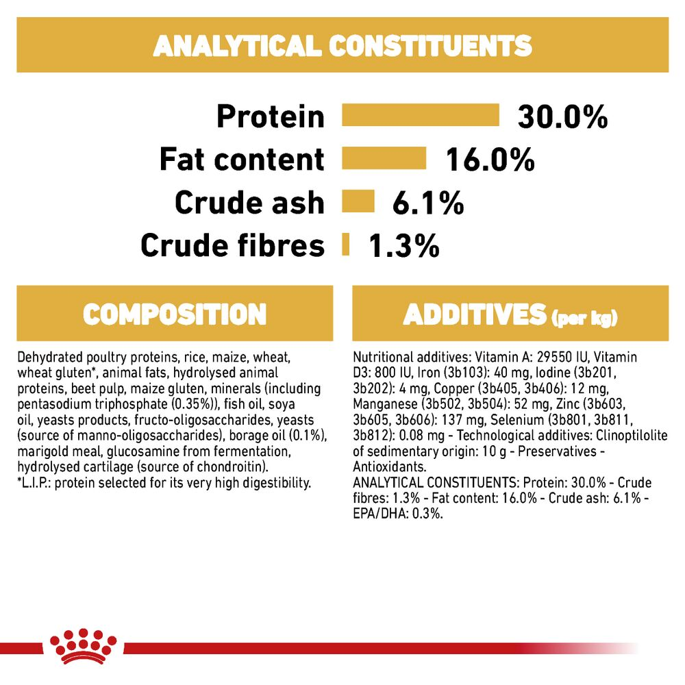 Composition: Dehydrated poultry proteins, rice, maize, wheat, wheat gluten, animal fats, hydrolysed animal proteins, beet pulp, maize gluten, minerals (including pentasodium triphosphate (0.35%)), fish oil, soya oil, yeasts products, fructo-oligosaccharides, yeasts (source of manno-oligosaccharides), borage oil (0.1%), marigold meal, glucosamine from fermentation, hydrolysed cartilage (source of chondroitin).L.I.P.: protein selected for its very high digestibility.