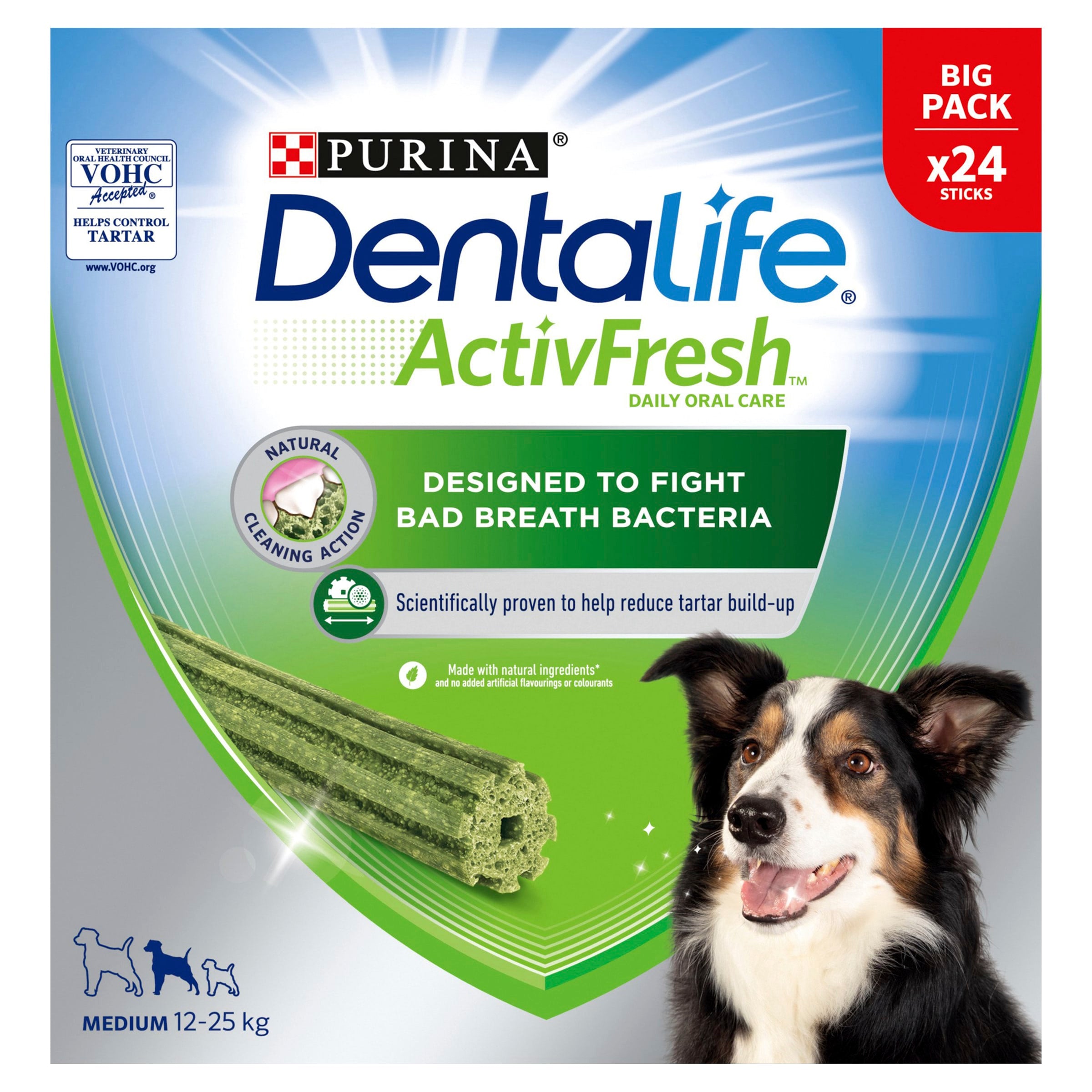 Instead of simply masking bad breath, Purina® Dentalife® ActivFresh®, containing natural spirulina and honey, is designed to help neutralize the bacteria responsible for bad breath. Activfresh® has the Dentalife® shape, size, and chewy, porous texture that is scientifically proven to help reduce tartar build-up. Shape, size, and texture scientifically proven to help reduce tartar build-up and clean even hard to reach teeth.