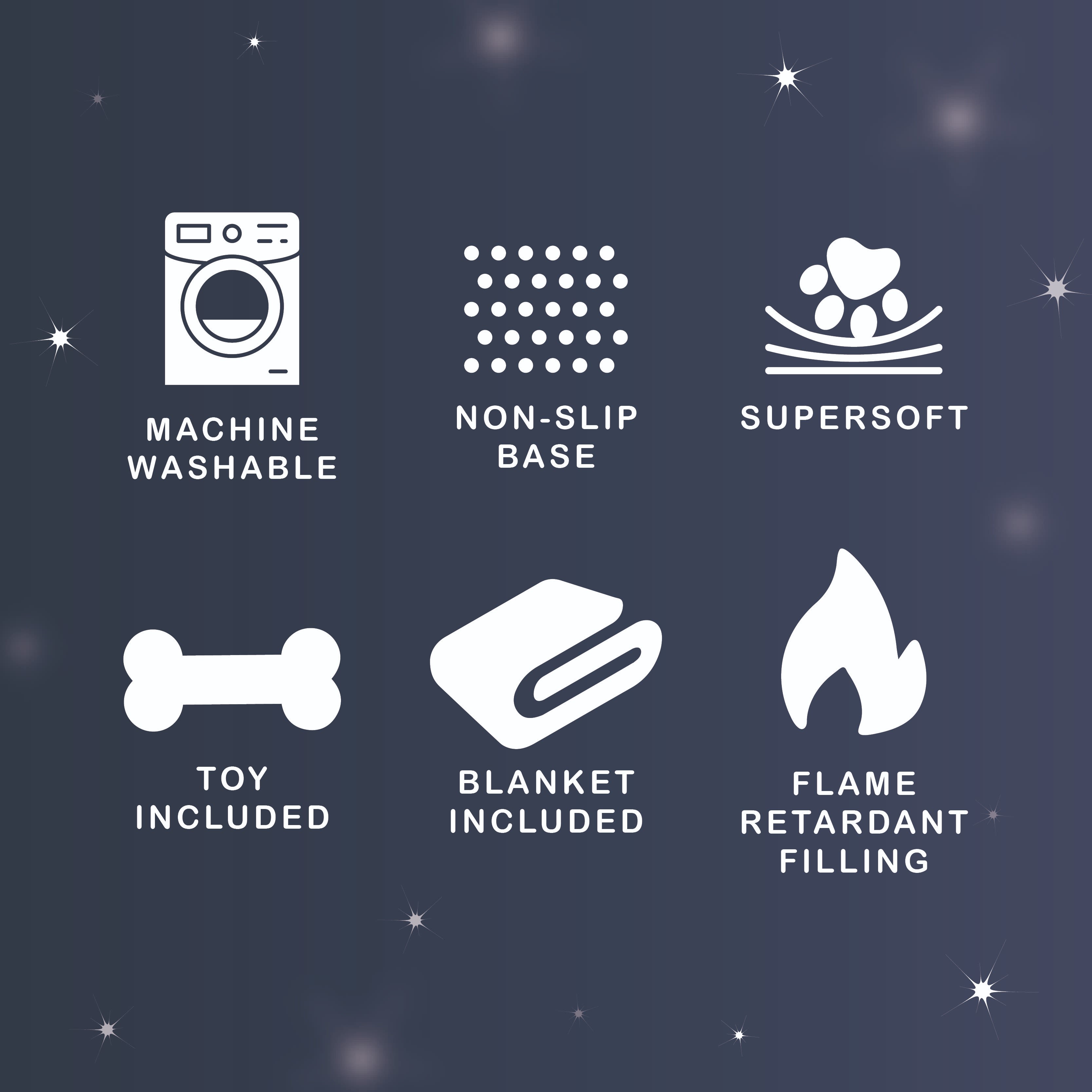 Part of the New Dream Paws Collection, this bed features a soft faux linen check exterior paired with an indulgently plush inner lining for warmth and comfort. The matching blanket adds extra snugness, while the adorable bone-shaped toy promises endless entertainment for your playful companion.