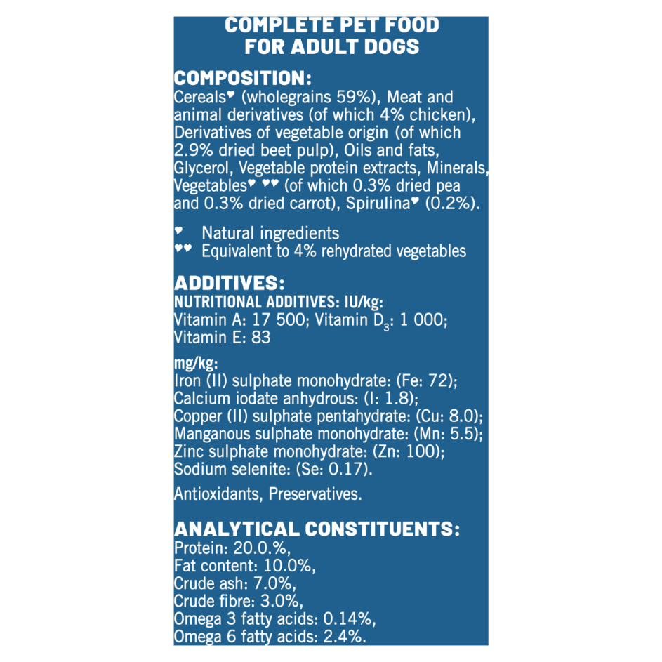 Composition: Cereals (wholegrains 59%), Meat and animal derivatives (of which 4% chicken), Derivatives of vegetable origin (of which 2.9% dried beet pulp), Oils and fats, Glycerol, Vegetable protein extracts, Minerals, Spirulina (0.2%).Natural ingredients equivalent to 4% rehydrated vegetables.