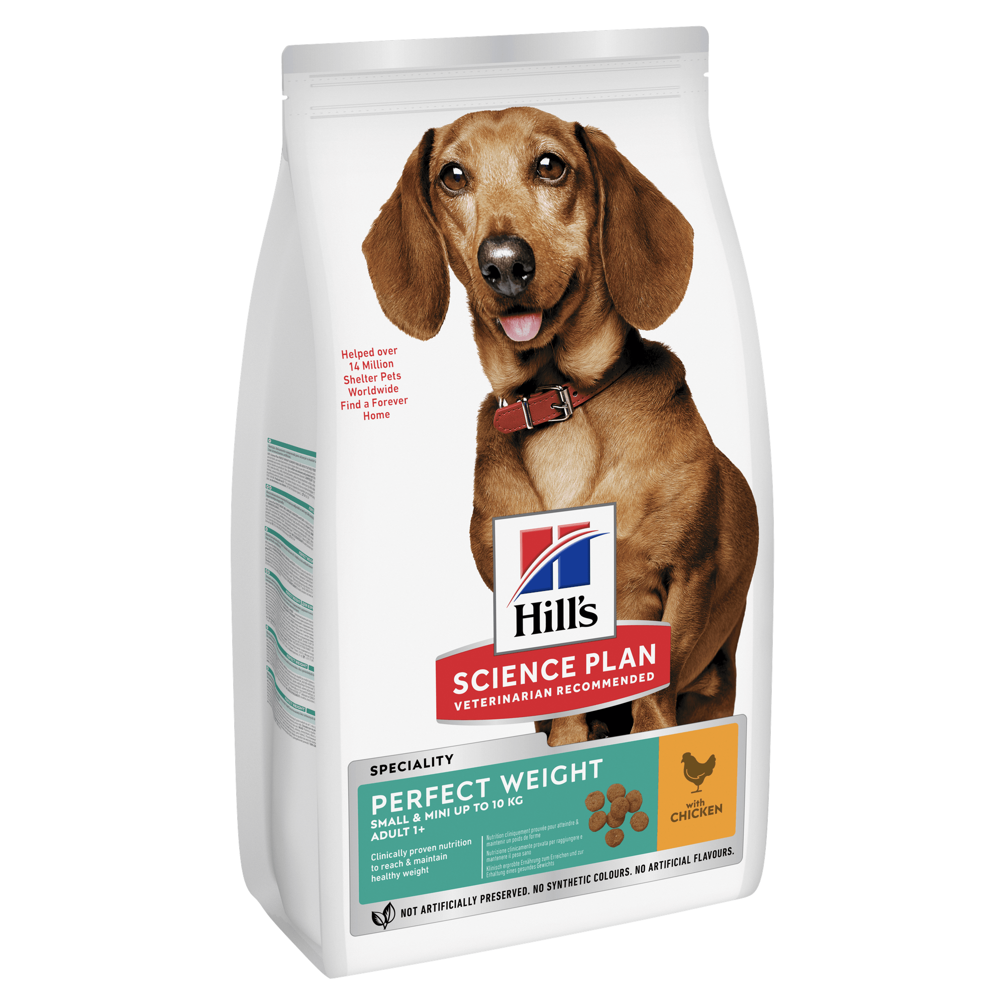 Hill's Science Plan Perfect Weight Small & Mini Breed Adult Dog Food with Chicken provides delicious, clinically proven nutrition to help your adult dog reach & maintain a healthy weight. This premium dry dog food for small & mini breed dogs contains a high protein, high fibre formula enriched with L-carnitine & coconut oil to support pets' metabolism, and prebiotic fibres for gentle digestion.