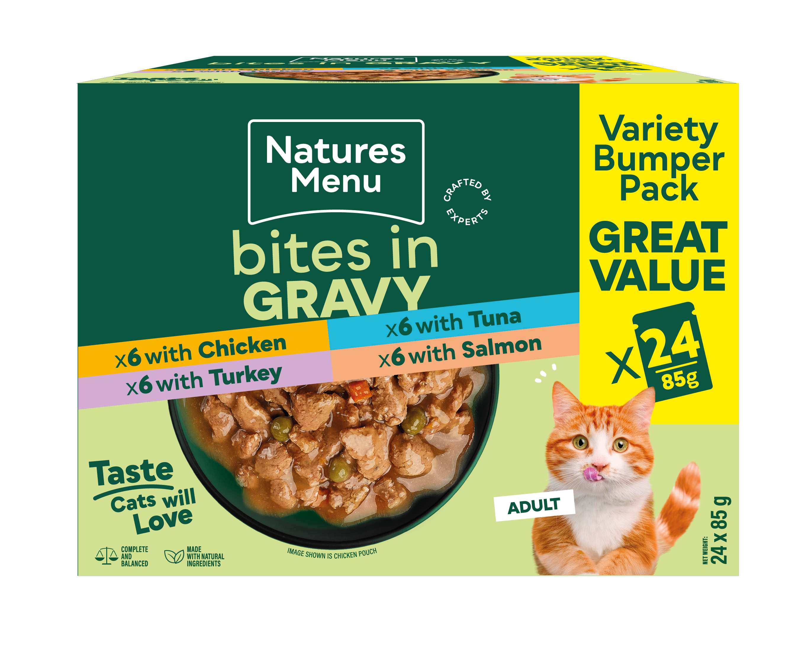 Each of our cat recipes are developed by our in-house experts to be complete and balanced. So when you serve your cat Nature’s Menu Bites in Gravy you know every mouthful is paw-sitively delicious and nutritious!