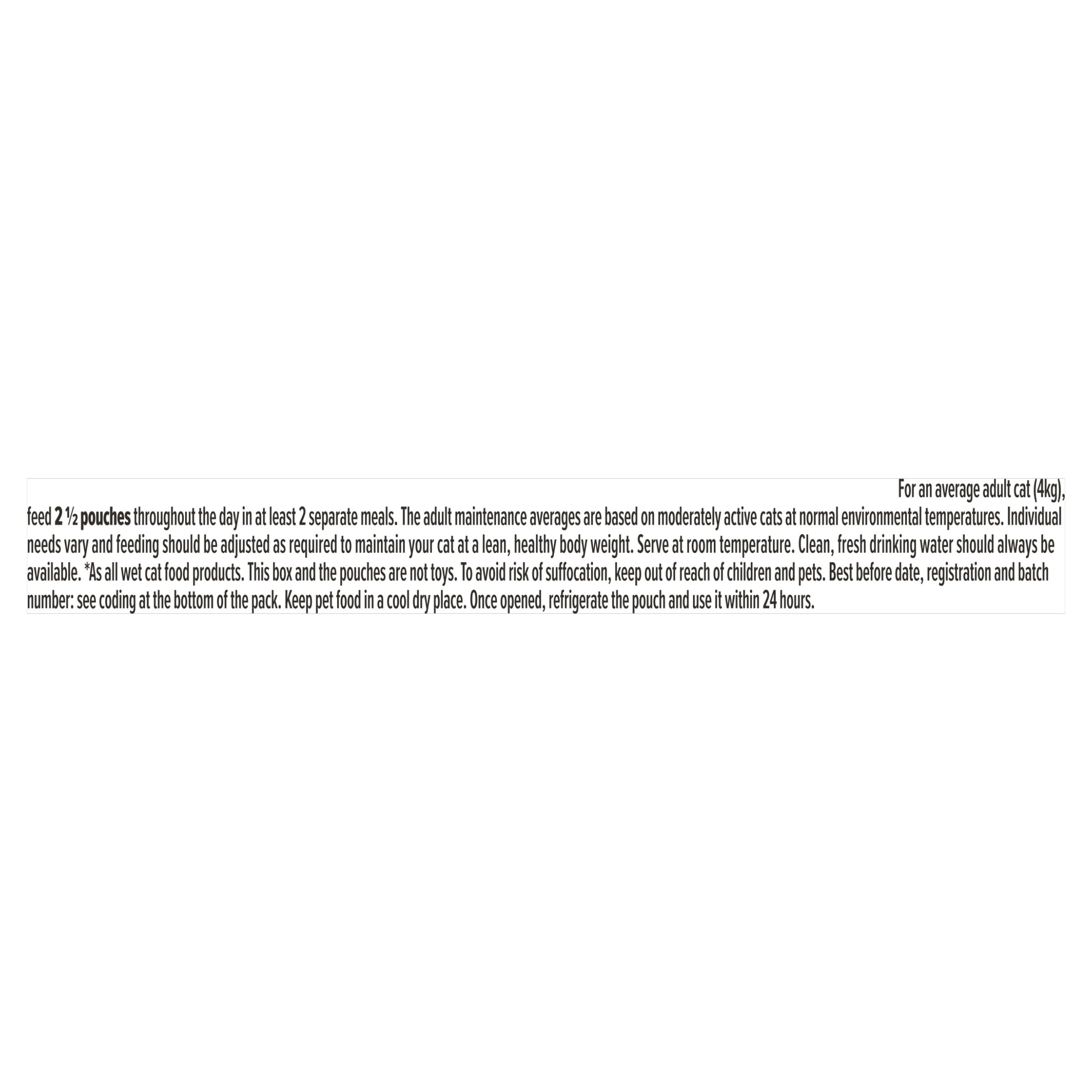 Feeding Guide: For An Average Adult Cat (4Kg), Feed 2 ½ Pouches Throughout The Day In At Least 2 Separate Meals. The Adult Maintenance Averages Are Based On Moderately Active Cats At Normal Environmental Temperatures. Individual Needs Vary And Feeding Should Be Adjusted As Required To Maintain Your Cat At A Lean, Healthy Body Weight. Serve At Room Temperature. Clean, Fresh Drinking Water Should Always Be Available.