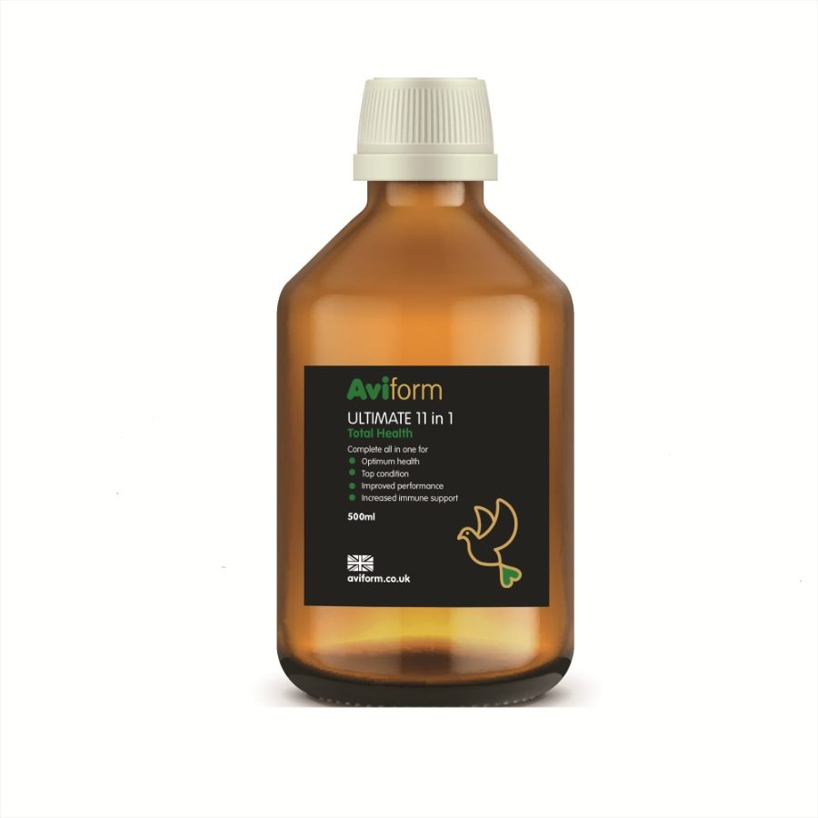 Aviform Ultimate 11in1 provides 13 high potency vitamins to help ensure peak health, condition and performance. This includes HY D – a potent vitamin D metabolite to support effective calcium absorption for egg quality and strength properties. Added DMG for improved stamina and recovery, essential oils for perfect feather condition and improved digestion.  A Prebiotic to help prevent bad bug build up and utilisation of nutrients. Pigeonguard, which is unique to Aviform Ultimate 11in1 helps prevent canker, cocci and worms.  Aviform Ultimate 11in1 also contains Electrolytes/Trace Elements to assist with recovery after racing and Amino Acids for even greater feather condition and the functioning of muscles. Finally, added Nucleotides assist with cell production, growth and tissue repair. The specification of Aviform Ultimate 11in1 is totally unique.