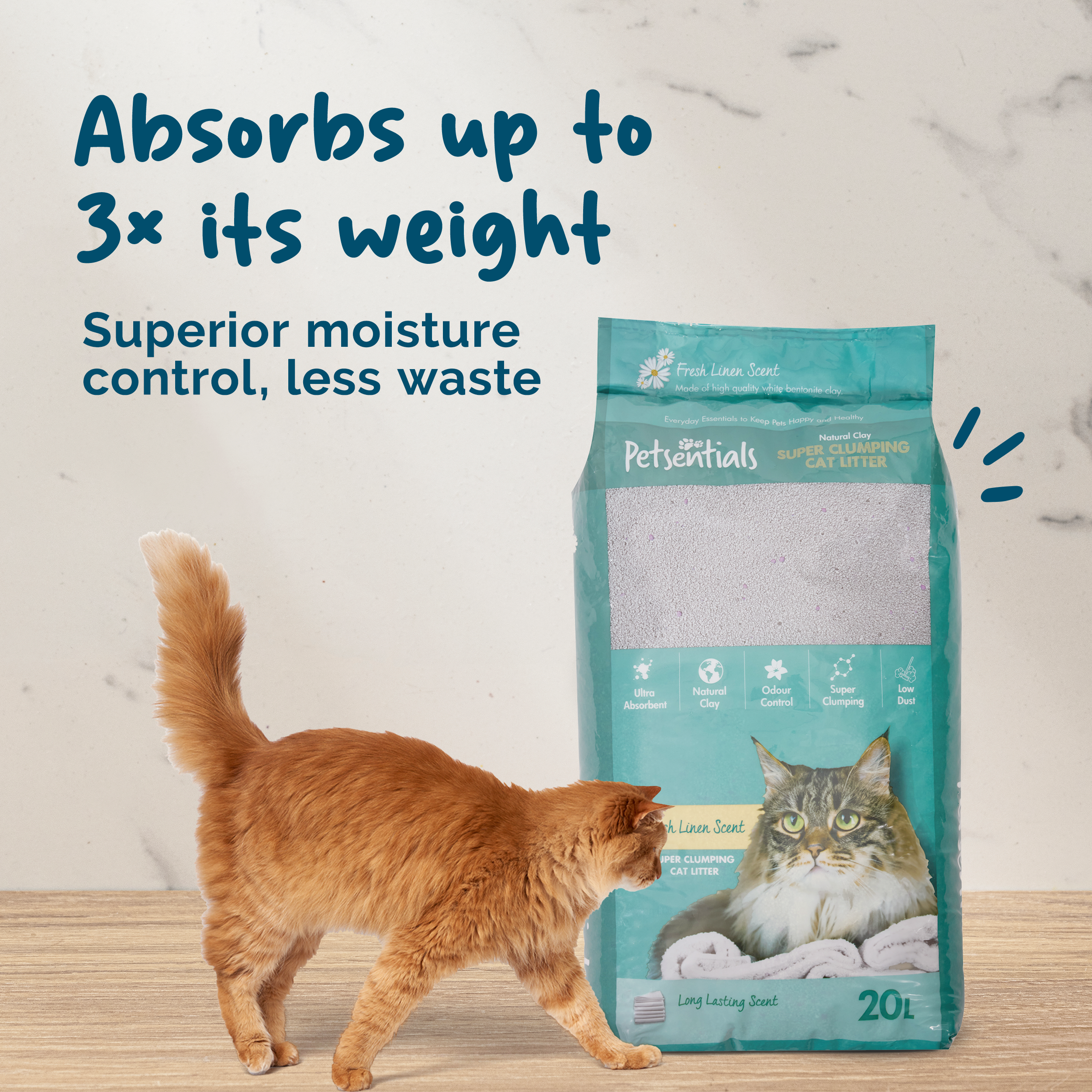 Petsentials Super Clumping Cat Litter with Fresh Linen Scent is the perfect choice for superior absorption and odour control. Made from high-quality bentonite clay, this litter forms quick, solid clumps when wet, making it easy to clean and reducing waste. It absorbs liquids up to three times its weight, keeping your cat's litter box dry and fresh.