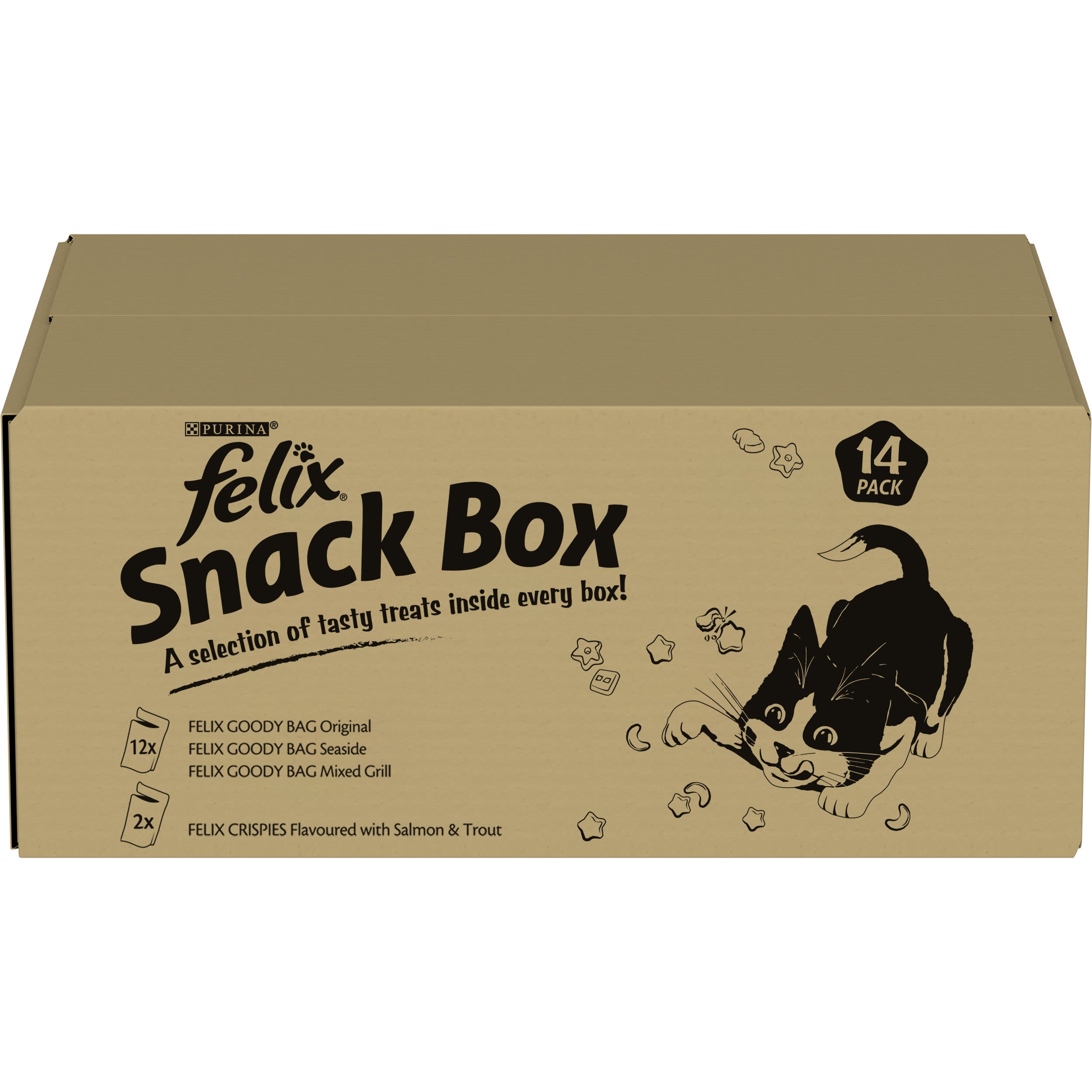 FELIX Goody Bag cat treats are a colourful, irresistible combination of meaty treats that are full of enticing aromas and fun shapes that we're sure your cat will love. FELIX Crispies treats for cats are deliciously air-whipped for a light and crispy texture. Our tasty cat treats are the perfect way to surprise your feline friend with a combination of flavours. FELIX Play Tubes are a tasty occasion to share a daily moment of bonding and fun together! Irresistibly playful thanks to their unique rolling shape, dual flavours, different sizes and tastiness of FELIX treats that your cat knows and loves. Snack Box contents: 2 FELIX Goody Bag Original, 2 Goody Bag Seaside Mix, 1 Goody Bag Mixed Grill, 1 Goody Bag Cheezy Mix, 1 Goody Bag Picnic Mix, 1 Goody Bag Dairy Delight, 1 FELIX Crispies Beef & Chicken, 2 Crispies Salmon & Trout, 1 FELIX Play Tubes Chicken & Liver & 2 FELIX Play Tubes Turkey & Ham.