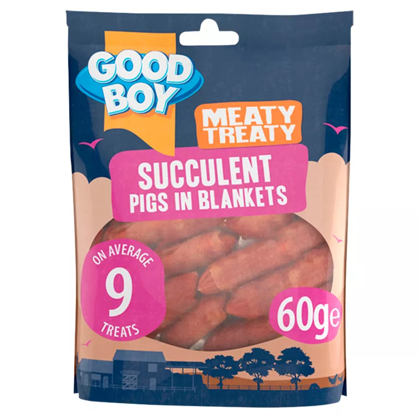 Good Boy's Succulent Pigs in Blankets are made with seriously meaty 100% natural meat and are sure to get your dog's tail wagging. These delicious treats are roasted in their own juices making them irresistibly tasty for your four-legged friends. There is simply no better way to reward your dog than with a super tasty Pig in Blanket dog treat, and better yet, they contain absolutely no wheat meaning they are great for those more sensitive tummies. The shape of these Pigs in Blankets makes sure they're loved by all dogs and means that your pooch can enjoy their favourite Christmas themed treat all year round.