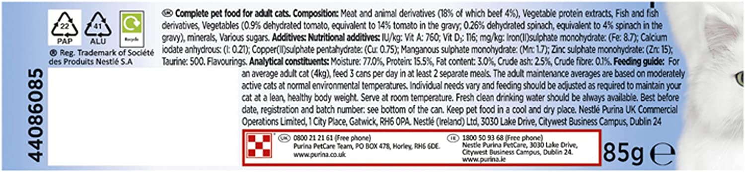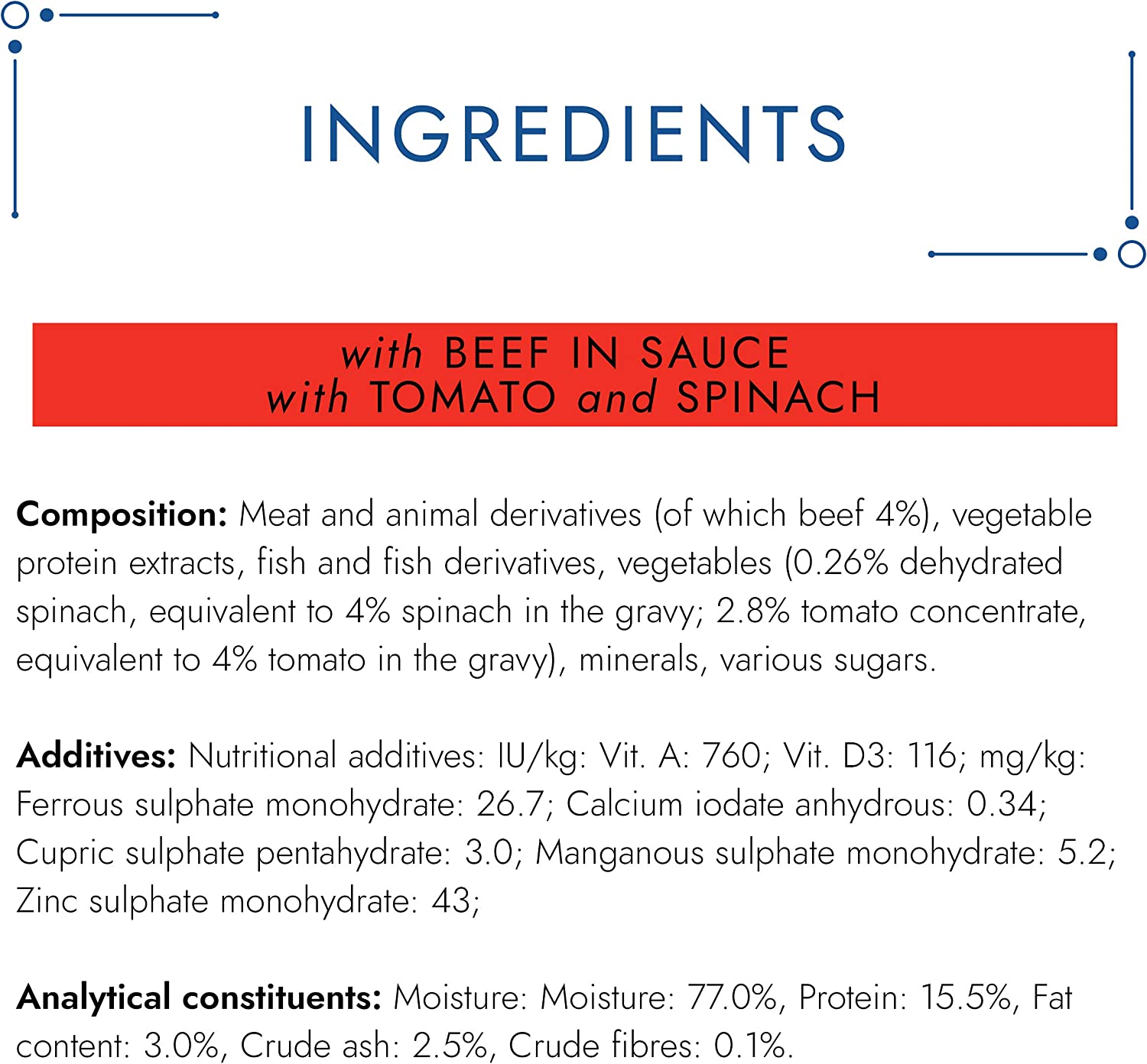 Meat and animal derivatives (of which beef 4%), Vegetable protein extracts, Fish and fish derivatives, Vegetables: (0.26% dehydrated spinach; equivalent to 4% spinach in the gravy; 2.8% tomato concentrate; equivalent to 4% tomato in the gravy), Minerals, Various sugars