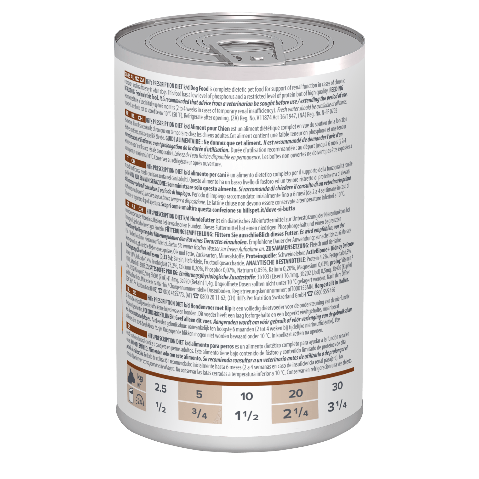 - Hill's Prescription Diet k/d Kidney Care with Chicken Canned Dog Food is a veterinary diet specially formulated by Hill’s nutritionists and veterinarians to help protect your dog’s kidney function