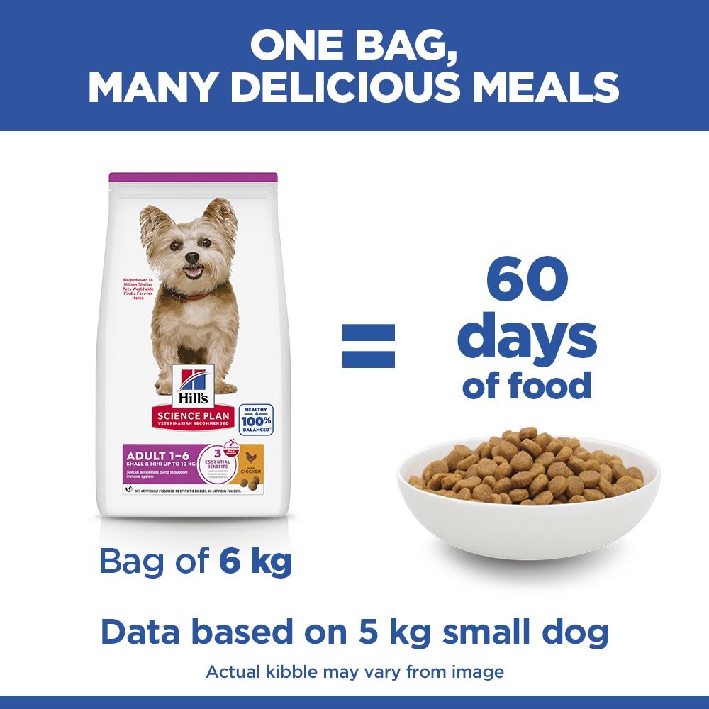 Big on Love, Small in Size. Hill's Science Plan Small & Mini Adult dog food with Chicken is tailored nutrition for the unique needs of Small & Mini dogs during the prime of their life. Specially made with smallest kibble. Easy-to-digest ingredients for healthy digestion. Nourishing Omega-6 & Vitamin E blend for healthy skin & luxurious coat. High-quality protein for lean muscles. Contains our special Small & Mini antioxidant blend for lifelong immune support