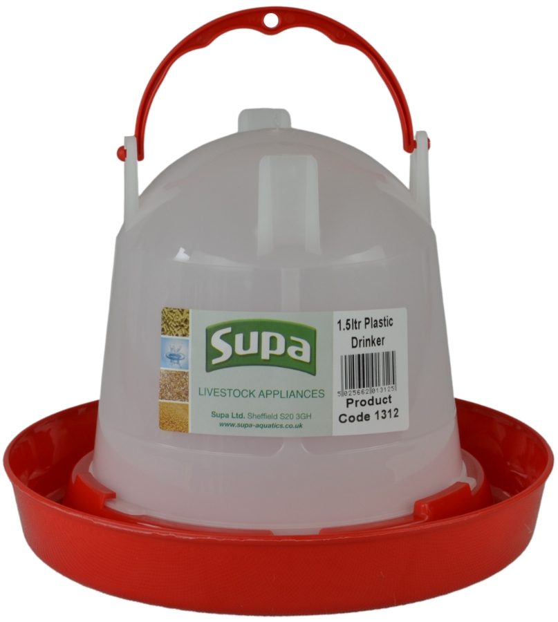 Supa Red and; White Drinker 1.5 Litre is a robust gravity fed drinker. The drinker can be ground based or hanging and is suitable for poultry and; game birds. Also suitable for cage and; aviary birds. The handle is ergonomically designed so make sure when carrying the drinker, you can do it with ease. Reduces the chance of the water becoming contaminated. Has a dosage scale so that medication can be added to the water accurately. The drinker has a dome shaped top to deter the birds standing on the top and contaminating the water. Easy to fill and easy to clean. Made in the UK. To Fill: Turn the drinker upside down, remove the base by twisting anti-clockwise and lifting the base off. Fill the drinker with water and lock the base into place by twisting clockwise ensuring the base and the body lock together. Turn back over and the drinker is ready for use. Dimensions of 1.5 Litre drinker with handle in the down position: 21cm (W) x 21.0cm (D) x 16cm (H) Dimensions of 1.5 litre drinker with handle in the up position: 21cm (W) x 21.0cm (D) x 20.1cm (H)