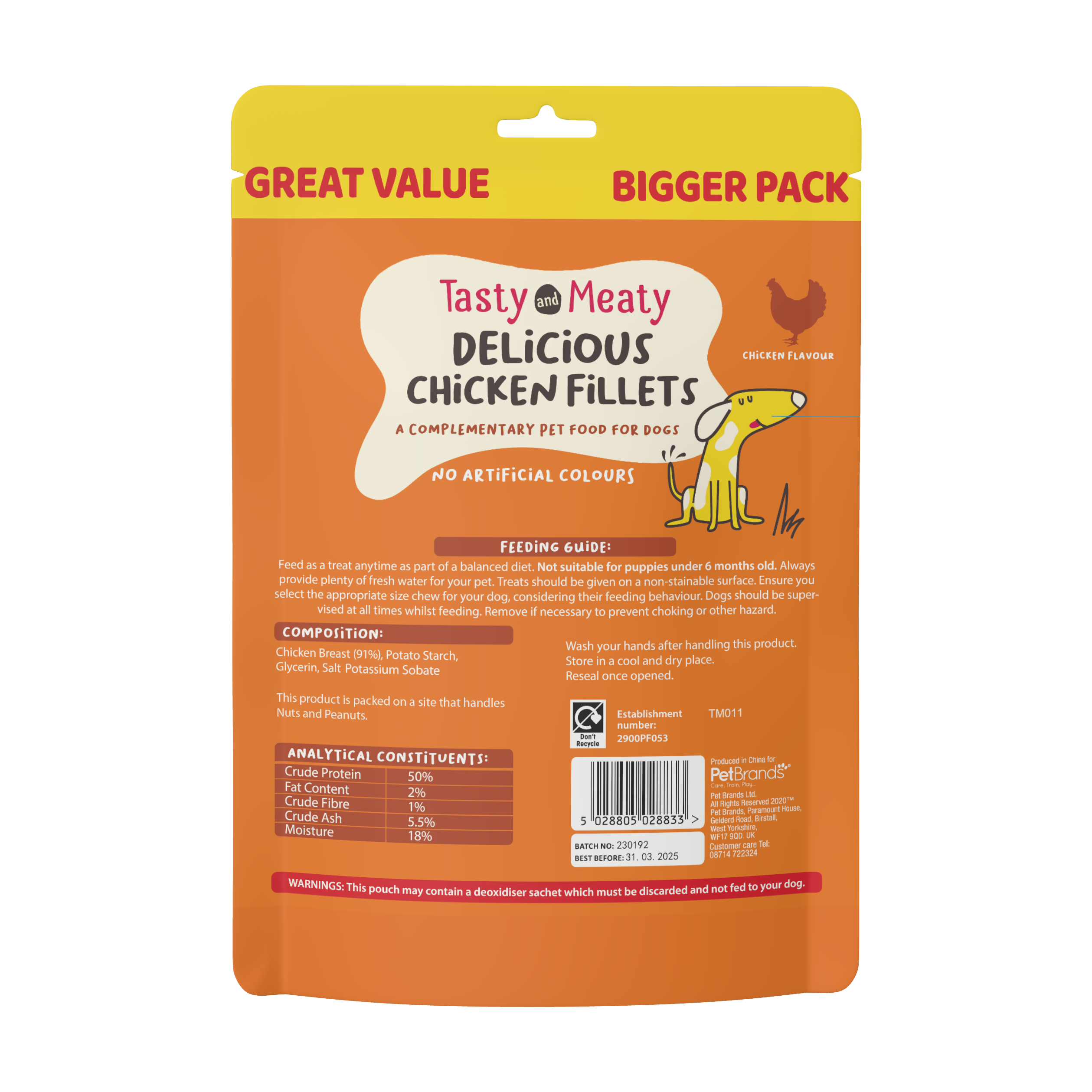 Treat your dog to a delicious and nutritious snack with our Tasty & Meaty Chicken Fillets! Made from real chicken breast, these high-protein, low-fat treats provide a healthy and satisfying reward for your furry friend. Packed with essential nutrients, they help support strength, energy, and overall well-being, making them the perfect treat for dogs who deserve the very best.
