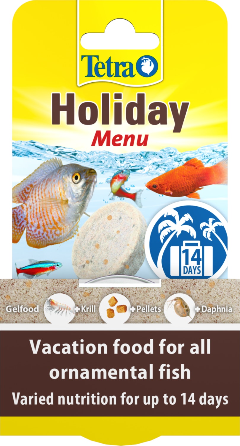 Tetra Holiday Menu provides your fish with a varied and reliable food supply while you are on holiday. The gel food block is 100% edible, lasts for up to 14 days and contains 3 different types of food plus other essential nutrients.